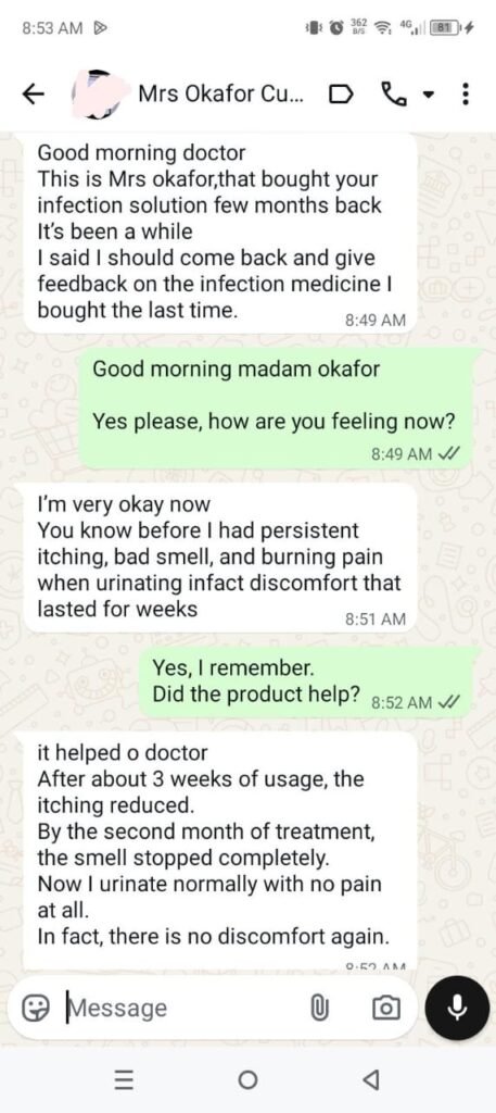“I couldn’t tell my husband what I was going through. The smell and discharge made me withdraw from intimacy. I felt broken. After one month on Infection Solution Capsule, everything normalized. My confidence returned. My marriage improved.”